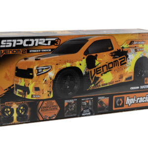 Is it a race truck, or a drift truck? HPI has the answer, “Both!” The Sport 3 Venom 2 1/10 Ready-to-Run (RTR) 4WD Brushed Electric Truck by HPI is a high-performance RC vehicle designed for for a versatile and stylish ride. With an updated Venom T-10 bodyshell, this model showcases a modern street truck aesthetic with striking graphics. Built on the robust Sport 3 chassis, it offers a sealed ball-bearing-supported drivetrain for low maintenance and high efficiency. This RTR includes two full sets of pre-mounted tires and wheels, allowing you to choose from sideways drift action or street racing fun. Whether you’re into drifting or street racing, the Sport 3 Venom 2 provides an adaptable platform that can handle a variety of driving styles and conditions.